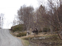 Ineens liepen ze daar voor ons huis... een moedereland met haar 2ling. Waarschijnlijk zijn ze gewoon via het pad in de vallei, dat bij de buren op de dorpsweg uitkomt, overgestoken. Bij de brievenbussen stonden ze even stil... dat was het moment dat ik de camera uit de lade griste en snel terugrende naar het keukenraam... te laat voor wat een geweldige foto zou zijn geworden, namelijk 3 elanden al speurend en om zich heen kijkend bij de brievenbus. Op de 2de foto zie je ze wat dichterbij, maar deze foto is niet scherp. Daarna staken ze het weggetje over, en bekeken het stukje land tegenover ons huis. Ik ging in de berm zitten, maar daar werd moedereland erg onrustig van; al brommend liep ze heen en weer (foto 3). Haar 2ling stond iets meer naar boven, richting zee. Uiteindelijk liepen ze verder, staken de dorpsweg weer over, en gingen via de weide naast en achter ons huis, de vallei weer in.